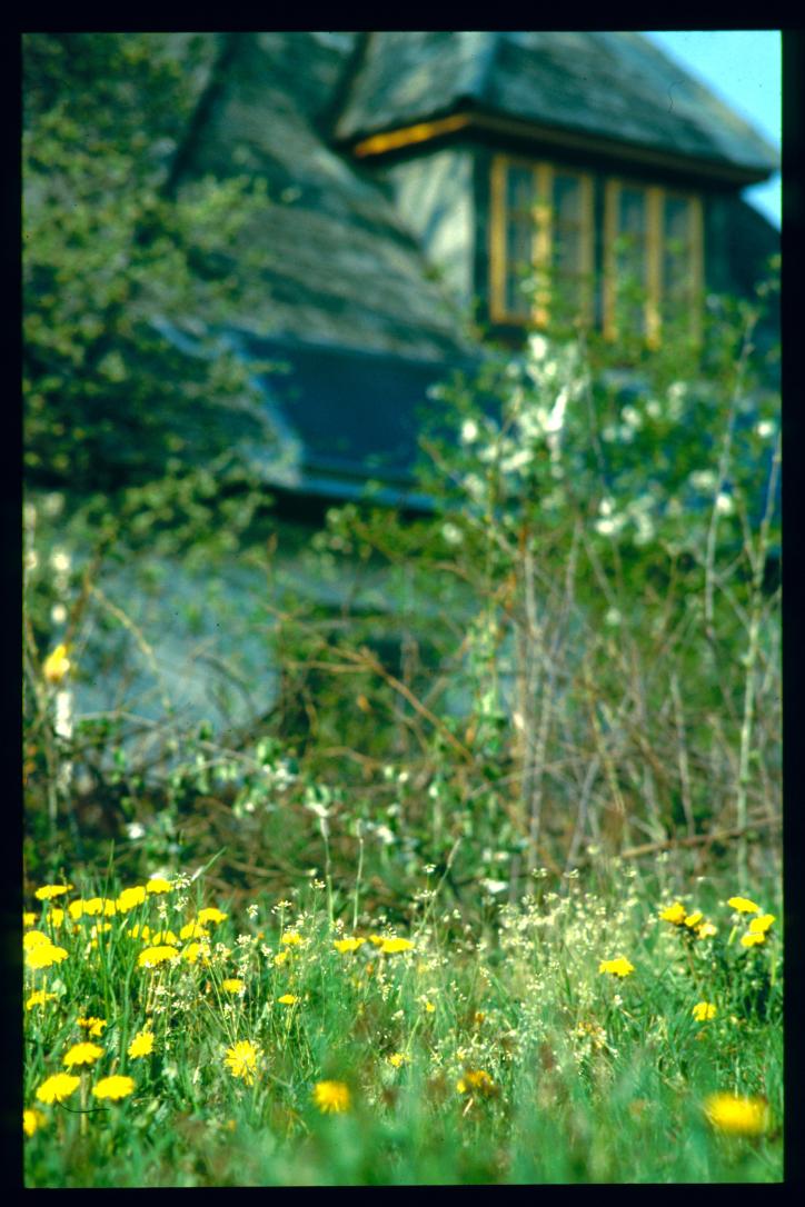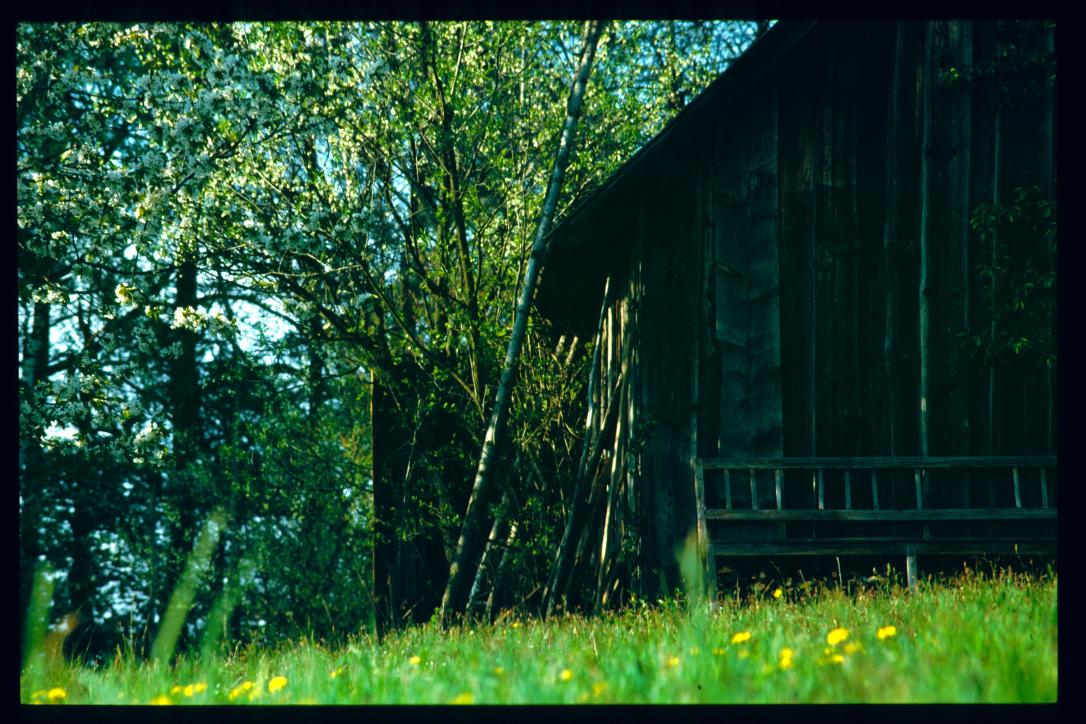 seyfrieds 1994/loewenzahnwiese mit 'stadel' (schuppen) und bank